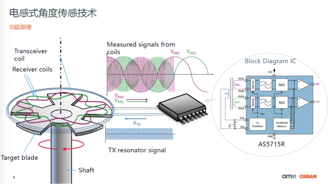 位置傳感器在汽車應用中非常廣泛,包括隨動大燈、電機、檔位、剎車電機等應用,都需要位置傳感器的參與。ams OSRAM提供了兩種不同的角度傳感器方案:磁旋轉(zhuǎn)角度傳感器和電感式角度傳感器。