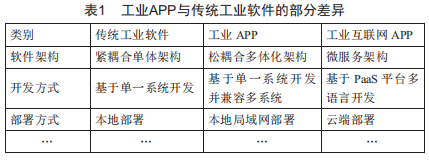 傳統(tǒng)工業(yè)軟件和工業(yè)APP存在表1所示的差異。嚴格說,工業(yè)APP是工業(yè)互聯(lián)網(wǎng)APP發(fā)展的一個前期階段,是企業(yè)目前最有可能實現(xiàn)的APP形式,因此將工業(yè)互聯(lián)網(wǎng)APP簡稱為工業(yè)APP有三個目的,一是體現(xiàn)了工業(yè)APP是工業(yè)互聯(lián)網(wǎng)APP發(fā)展過程中最重要、最常見、最務(wù)實的階段,二是強調(diào)開發(fā)工業(yè)APP的最終目的是工業(yè)互聯(lián)網(wǎng)APP,三是與相關(guān)文件術(shù)語描述保持一致。