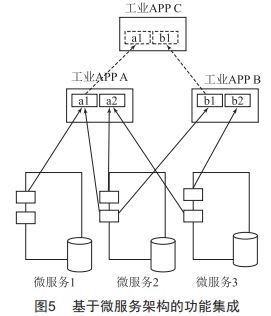 應(yīng)用協(xié)作場景的工業(yè)APP集成本質(zhì)是將工業(yè)APP功能拆分后的重新組合,屬于系統(tǒng)細分功能集成,在工業(yè)APP本身架構(gòu)基礎(chǔ)較好的情況下經(jīng)濟性尚可,否則成本較高?;谖⒎?wù)架構(gòu)的工業(yè)APP集成架構(gòu)如圖5所示。