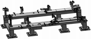 本文以汽車地板自動補(bǔ)焊過程中夾具對后縱梁的影響來做靜力學(xué)分析。由于地板補(bǔ)焊工位夾具的設(shè)計主要采用勾銷氣缸對產(chǎn)品進(jìn)行夾緊,因此勾銷氣缸夾緊力的大小與產(chǎn)品的變形有很大關(guān)系,所以在靜力學(xué)分析時著重對由勾銷缸引起產(chǎn)品變形的部位進(jìn)行重點分析。圖1為地板自動補(bǔ)焊工位夾具的3D結(jié)構(gòu)圖。