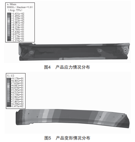 利用Abaqus6.l4對產(chǎn)品進(jìn)行靜力學(xué)分析,可以得到產(chǎn)品的應(yīng)力、應(yīng)變以及變形情況。圖4為產(chǎn)品應(yīng)力分布情況圖,圖5為產(chǎn)品變形情況分布圖。