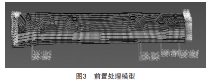 (2)網(wǎng)格劃分:網(wǎng)格劃分是一個非常重要的環(huán)節(jié),網(wǎng)格質(zhì)量是決定求解的重要因素,質(zhì)量越好,則計算精度越高,而且可以節(jié)約計算用時。同時也要根據(jù)結(jié)構(gòu)尺寸選擇合適的網(wǎng)格單元類型,這樣可以提高有限元模型的網(wǎng)格精度,獲得更加精確的分析結(jié)果。因此,選用PsHELL面單元簡化產(chǎn)品數(shù)模,然后再選用Hypermesh14.0前處理軟件對車身產(chǎn)品進(jìn)行網(wǎng)格劃分。從劃分結(jié)果得到:整個模型共包含6148個節(jié)點,5984個單元,5385個Ouad4單元,網(wǎng)格大小設(shè)置為10mm。網(wǎng)格劃分結(jié)果如圖3所示。