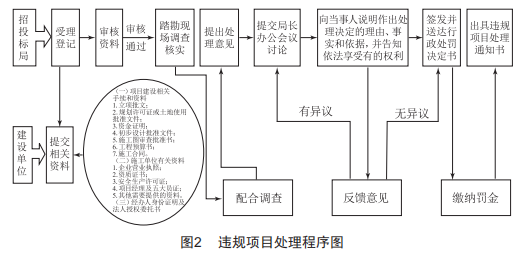 為了有效規(guī)避建筑行業(yè)招投標中的違規(guī)行為,監(jiān)管部門要建立健全的違規(guī)項目處理程序(圖2),監(jiān)管部門要注重利用法律手段來嚴懲建設(shè)單位與招標代理機構(gòu)、投標單位的違法行為,并且建立建設(shè)單位信用檔案、招標代理機構(gòu)以及投標單位信用檔案,定期公示企業(yè)的不良行為。同時,監(jiān)管部門要嚴格查處建筑行業(yè)市場的相關(guān)企業(yè)違規(guī)行為,針對商業(yè)賄賂、規(guī)避招投標的行為和做法、鄙視潛在投標人等行為,要按照招標投標法律法規(guī)要求進行嚴格處理,如取消投標資格,依法扣押、吊銷資質(zhì)證書等。