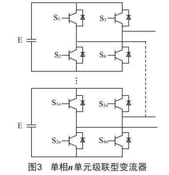 級聯(lián)型多電平變流器的拓?fù)浣Y(jié)構(gòu)是由F.Z.Peng于1995年提出的,采用具有獨(dú)立直流電源的H橋作為基本功率單元,如圖3所示,由n個(gè)模塊級聯(lián)構(gòu)成的單相變流器,輸出電平數(shù)為2n+1,實(shí)現(xiàn)了高壓多電平輸出。這種結(jié)構(gòu)已經(jīng)有了模塊化的理念,每個(gè)功率單元具有相同的結(jié)構(gòu),便于設(shè)計(jì)和封裝:與鉗位型變流器相比,在輸出相同電平數(shù)的情況下,所需元件數(shù)大大減少:每個(gè)功率單元單獨(dú)進(jìn)行控制,可不用考慮均壓問題,控制策略簡單。