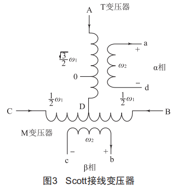 圖中以A相為原邊、α相為副邊構(gòu)成的變壓器稱為T變壓器,以B、C相為原邊、β相為副邊構(gòu)成的變壓器稱為M變壓器,是主變壓器。Scott變壓器之所以稱為"垂直不等邊變壓器",是因為α相與β相輸出電壓相位垂直、幅值不等,T變壓器與M變壓器一次繞組連接點并非中性點,而是圖中的D點,使這兩個變壓器原邊電壓作為高壓匹配變壓器,兩者用處不同,因此兩個變壓器副邊匝數(shù)不再相等,前者副邊匝數(shù)不變,而后者副邊匝數(shù)根據(jù)補償裝置的特性進行設(shè)定。
