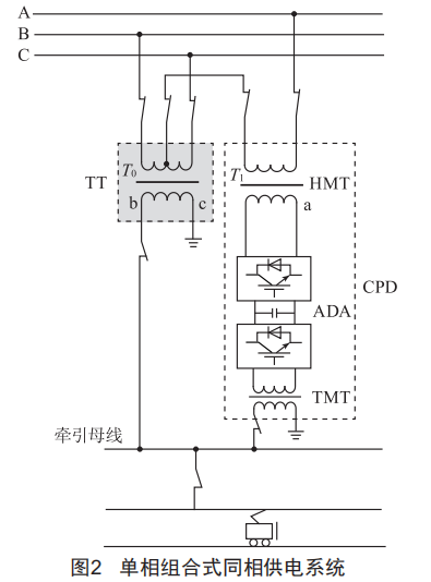 組合式結(jié)構(gòu)同相供電系統(tǒng)的優(yōu)勢在于:牽引變壓器與同相補償裝置在結(jié)構(gòu)上不捆綁,補償裝置投運與否不影響牽引變壓器工作,其主要功能是補償負(fù)序電流,同時兼顧輔助牽引變壓器供電的任務(wù),是目前國內(nèi)科研與工程應(yīng)用中主流的技術(shù)方案。其中單相組合式同相供電系統(tǒng)由于其牽引變壓器容量利用率高、裝置集成度高以及占地面積少等優(yōu)點,適用于新建電氣化高速鐵路。