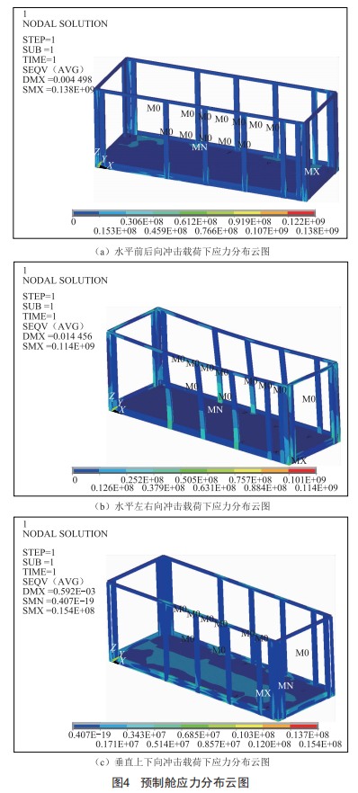 在ANsYs中分別對(duì)預(yù)制艙3個(gè)方向的沖擊載荷情況進(jìn)行仿真分析,得到預(yù)制艙在各條件下的應(yīng)力分布云圖和變形量分布云圖。