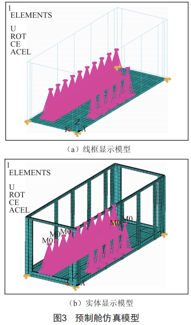 (1)預(yù)制艙內(nèi)設(shè)備質(zhì)點(diǎn)MAss21單元通過(guò)剛性梁與底板相應(yīng)區(qū)域節(jié)點(diǎn)進(jìn)行連接。