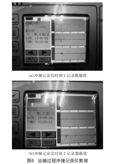 2018年10月,該移動(dòng)變電站由武漢運(yùn)往山西,在預(yù)制艙底板上安裝一套沖撞記錄儀。運(yùn)輸過(guò)程經(jīng)過(guò)一段未鋪砌土路,車(chē)輛顛簸較嚴(yán)重,圖6為運(yùn)輸過(guò)程中沖撞記錄儀記錄的數(shù)據(jù)中比較有代表性的兩個(gè)時(shí)刻點(diǎn)。