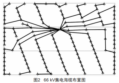 近海深水區(qū)域900Mw大型海上風電項目的66kV集電海纜布置如圖2所示。