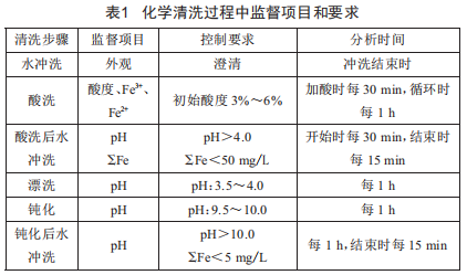化學(xué)清洗過(guò)程中監(jiān)督項(xiàng)目和要求如表1所示。
