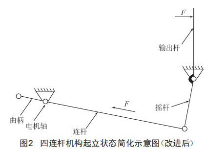 通過(guò)改進(jìn)四連桿機(jī)構(gòu),利用其"死點(diǎn)"位置,使輸出桿在受到外力作用下晃動(dòng)角度控制在±19,有效解決了輸出桿在起立位置受載條件下的晃動(dòng)問(wèn)題。利用四連桿的"急回"特性,延長(zhǎng)起立時(shí)間,減小起立位置瞬間輸出桿的慣性力,可有效減緩起立瞬時(shí)沖量,提升起立瞬間的穩(wěn)定性。