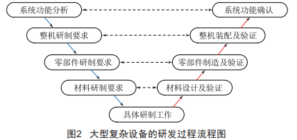 通常來說,大型復雜設備的研發(fā)過程如圖2所示,工作內(nèi)容大體上可分為設計和驗證兩部分。在設計過程中采用自上而下、分層級設計和迭代的方法,在明確設備總體功能的基礎上,以整機功能分解及可靠性分配為主線,確定各零部件的可靠性要求,并將零部件的可靠性要求落實到材料選擇上,據(jù)此開展設備的具體研制工作:設備的可靠性驗證工作與設計工作的開展路線相反,自下而上地逐級進行,依次驗證材料、零部件、整機的功能及其可靠性,確保其在預期壽期內(nèi)不會因設計、制造、安裝工藝等缺陷而導致設備故障。
