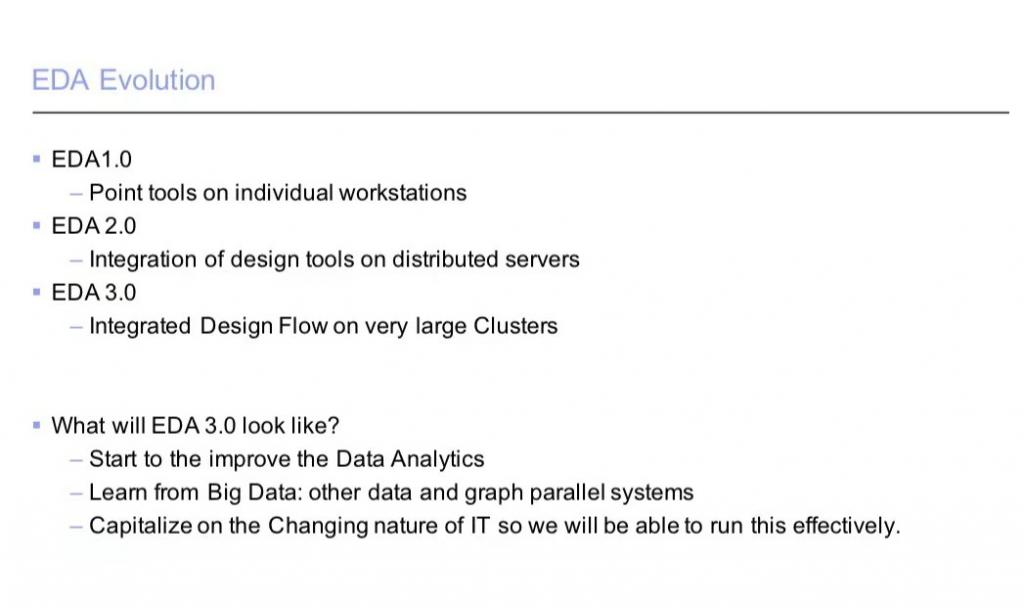 伴隨著 EDA 核心技術(shù)的進(jìn)步,在初步成形的 EDA 全流程平臺上,業(yè)界開始嘗試各個方向的商業(yè)性探索。比如 2014~2015 年左右,大數(shù)據(jù)和云計算潮流處于風(fēng)頭浪尖的時候,業(yè)界開始有人基于對 EDA 流程中計算力需求和數(shù)據(jù)流瓶頸的分析,在一些正式場合曾提出所謂的 EDA3.0 EDAaaS:開放工具和技術(shù)平臺,用面向大數(shù)據(jù)和云計算的模式來開展設(shè)計服務(wù)的轉(zhuǎn)型。這個探索側(cè)重于對現(xiàn)有 EDA 用戶的硬件設(shè)計過程中的計算需求做優(yōu)化,對用戶已經(jīng)積累的海量設(shè)計數(shù)據(jù)進(jìn)行再處理,提取并重組有效信息以簡化和縮減產(chǎn)品設(shè)計周期,甚至試圖實現(xiàn)產(chǎn)品本身的優(yōu)化和差異化等。
