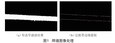 焊縫圖像形態(tài)學(xué)濾波結(jié)果如圖1(a)所示,圖1(b)為焊縫過(guò)渡帶邊緣提取結(jié)果。從圖1中可知,利用形態(tài)學(xué)算子能濾除圖像中的干擾,準(zhǔn)確提取焊縫特征。