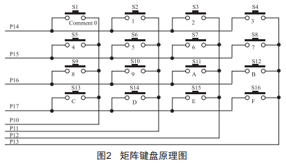 裝置的信息輸入接口是一塊4×4的矩陣鍵盤,為減少I/o口資源的占用,矩陣鍵盤的驅(qū)動使用按鍵掃描的方法。按鍵掃描只需占用8個I/o口,4個行公共引腳及4個列公共引腳。矩陣鍵盤的原理圖如圖2所示。
