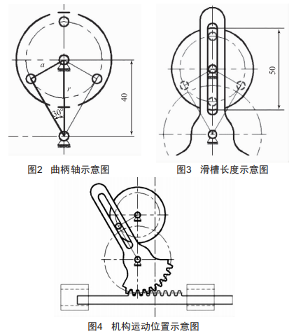 由擺動角度60°,計算出a=r×sin30°,得a=20mm,由此計算出曲柄長度為20mm,如圖2所示。