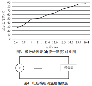 我們認(rèn)為轉(zhuǎn)換表的溫度值和檢測(cè)到的電流、電壓值之間存在著一定的關(guān)系,經(jīng)過(guò)不斷的測(cè)試和試驗(yàn),發(fā)現(xiàn)此關(guān)系為一次函數(shù),確定以下電流/電壓檢測(cè)溫度。