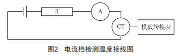 接線(xiàn)如圖2所示,將蓄電池、負(fù)載(電阻)、電流表串聯(lián)成一回路,將鉗形直流電流傳感器鉗口部分穿過(guò)回路導(dǎo)線(xiàn),與模數(shù)轉(zhuǎn)換表相連。模數(shù)轉(zhuǎn)換表調(diào)節(jié)到電流溫度檔即可觀(guān)察到數(shù)據(jù)輸出。