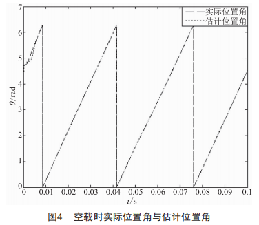 在空載情況下,對控制系統(tǒng)的性能進(jìn)行了仿真測試,其中轉(zhuǎn)速及位置角如圖3、圖4所示。