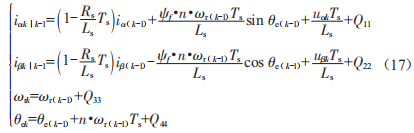 選取系統(tǒng)狀態(tài)變量分別為a8坐標(biāo)系下的兩相電流、電機(jī)機(jī)械轉(zhuǎn)速、電機(jī)電角度[iai8or9e]T、[.a.8]T作為輸入變量,[iai8]T作為輸出變量,可以得到離散化的系統(tǒng)狀態(tài)轉(zhuǎn)移方程: