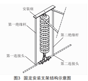 固定安裝支架包括安裝座、絕緣桿以及連接頭,安裝座一端固定在輸電線路鐵塔塔材上,另一端與絕緣桿上端連接,絕緣桿下端通過連接頭與導(dǎo)線相連。