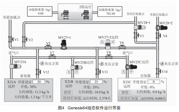 本次加氯系統(tǒng)改造選用了Genesis64工業(yè)組態(tài)軟件作為上位機(jī)監(jiān)控軟件,其運(yùn)行界面如圖4所示。上位機(jī)與PLC通過以太網(wǎng)通信,需要設(shè)置PLC和上位機(jī)的IP地址以及網(wǎng)關(guān)。上位機(jī)作為MoDBUs/TCP主站,PLC作為MoDBUs/TCP從站。PLC將變量以及I/o變量等打包到內(nèi)存字(%Mw類型),%Mw類型地址再映射為MoDBUs地址,通過MoDBUs地址與Genesis64組態(tài)軟件中的控件進(jìn)行綁定,上位機(jī)最終實(shí)現(xiàn)Genesis64組態(tài)軟件對加氯機(jī)、電動閥的遠(yuǎn)程輸出控制以及對加氯機(jī)、電動閥狀態(tài)的輸入監(jiān)視。