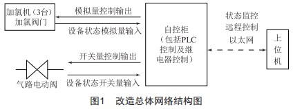 由于目前被廣泛采用的PID控制加氯法對水質(zhì)參數(shù)變化反饋存在滯后的現(xiàn)象,當(dāng)原水參數(shù)突變時,往往達(dá)不到預(yù)期的控制效果[3]。基于上述原因,新加氯系統(tǒng)創(chuàng)新改造設(shè)計(jì)為在上位機(jī)運(yùn)用Genesis64組態(tài)軟件,通過以太網(wǎng)通信的方式控制施耐德Premium系列TsxP573634M型號PLC對3臺全新w&T牌加氯機(jī)的加氯閥門進(jìn)行模擬量控制輸出,從而控制加氯量:對加氯系統(tǒng)中氣路電動閥門進(jìn)行開關(guān)量控制輸出,從而控制氯氣閥門的開關(guān),最終實(shí)現(xiàn)遠(yuǎn)程控制加氯機(jī)投加氯氣的目的。改造總體網(wǎng)絡(luò)結(jié)構(gòu)示意圖如圖1所示。