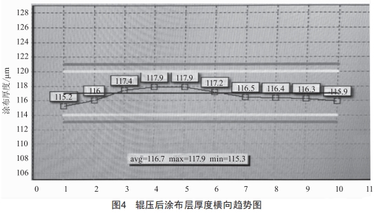 針對(duì)涂布層寬度方向取10個(gè)點(diǎn),激光在線測(cè)厚儀檢測(cè)得出的厚度橫向趨勢(shì)圖如圖4所示??梢钥吹?涂布厚度最大為117.9μm,最小為115.2μm,厚度平均值為116.7μm,涂布厚度精度范圍可達(dá)到士1.4μm,接近國(guó)際先進(jìn)水平。其中最小厚度基本處于兩端,最大厚度偏向于中間位置。