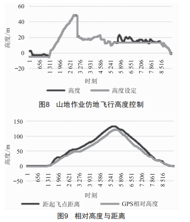 設(shè)計(jì)的控制器在Z-3N無人直升機(jī)進(jìn)行了試飛驗(yàn)證,圖8、圖9數(shù)據(jù)是Z-3N無人直升機(jī)進(jìn)行山地除草時(shí)的仿地飛行數(shù)據(jù),在5300至8300時(shí)刻(共計(jì)200S)打開仿地飛行功能,高度設(shè)定值為13.6m:仿地飛行過程中飛機(jī)飛行距離105m,飛機(jī)GPS高度下降100m,可見山地坡度已達(dá)459,而雷達(dá)高度設(shè)定值與反饋值最大偏差6m,仿地效果較好。