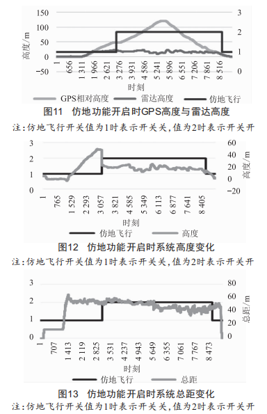 如圖11所示,仿地飛行開啟時(shí)GPS高度與雷達(dá)高度有接近30m偏差:圖12表明仿地飛行開啟后系統(tǒng)切換至雷達(dá)高度,故系統(tǒng)高度出現(xiàn)近30m的突跳:由圖13可知,仿地飛行開啟時(shí)總距沒有變化,沒有給飛機(jī)帶來擾動(dòng)。由此可見,仿地飛行開啟時(shí)雖然系統(tǒng)高度產(chǎn)生近30m的突跳,但總距變化不大,飛機(jī)垂向平穩(wěn)。