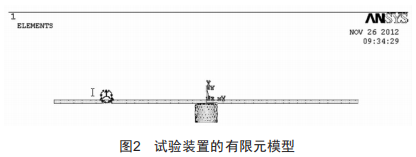 沖擊試驗(yàn)中,一般采用沖擊響應(yīng)譜作為試驗(yàn)參考譜,根據(jù)譜型變化對試驗(yàn)裝置參數(shù)進(jìn)行調(diào)整。在ANsYs中,使用實(shí)體單元solid164建立響應(yīng)板和彈丸(運(yùn)動質(zhì)量塊)模型,如圖2所示。在沖擊過程中,由于響應(yīng)板產(chǎn)生彈塑性變形,所以建模材料采用與應(yīng)變率有關(guān)的各向同性的PlasticKinematic材料模型:彈丸在本文中不考慮其動態(tài)響應(yīng),假設(shè)為剛性體,其材料屬性為剛性體材料屬性。