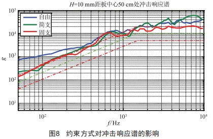 可以看到,約束對沖擊響應(yīng)譜低頻段的幅值有明顯抑制,對高頻段幅值和拐點(diǎn)頻率的影響不明顯,實(shí)際試驗(yàn)中常通過改變響應(yīng)板安裝形式來實(shí)現(xiàn)控制譜形的目的。
