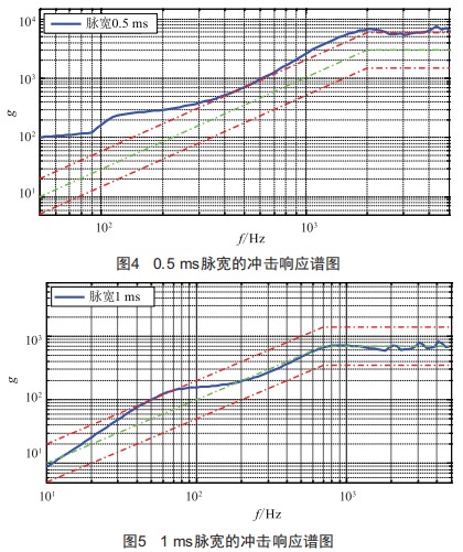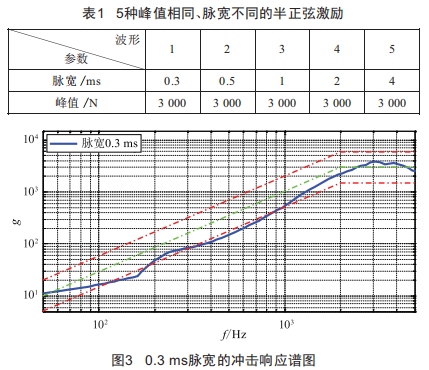 由于激勵脈寬的改變對沖擊響應(yīng)譜拐點(diǎn)頻率和高頻段響應(yīng)幅值有明顯影響,實(shí)際試驗(yàn)中常通過改變波形發(fā)生器來調(diào)節(jié)激勵脈寬,從而實(shí)現(xiàn)控制譜形的目的。