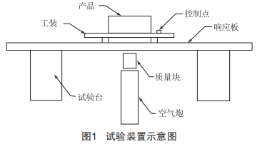 響應(yīng)板式爆炸沖擊模擬裝置是試驗(yàn)室常用的模擬裝置之一,其使用空氣炮加速一運(yùn)動質(zhì)量塊撞擊響應(yīng)板,在響應(yīng)板上激起近似于爆炸沖擊環(huán)境的復(fù)雜振蕩衰減波,并由工裝傳遞至產(chǎn)品上,完成對產(chǎn)品的沖擊考核,如圖1所示。參試產(chǎn)品與臺面法向一致方向受到的沖擊較大,而另外兩個正交方向的沖擊量級相對較小,可認(rèn)為參試產(chǎn)品經(jīng)受了主沖方向(臺面法向)的單方向沖擊試驗(yàn)考核。