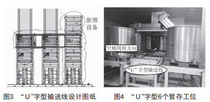 通過對現(xiàn)場設(shè)備結(jié)構(gòu)和控制原理的掌握以及對工藝生產(chǎn)流程的了解,為了縮短料桶周轉(zhuǎn)時間,提高生產(chǎn)效率,可以換一種思路去實現(xiàn)料桶周轉(zhuǎn),考慮將空桶和料桶的進(jìn)、出方向分開,改變料桶進(jìn)出方向。因此,大膽提出并設(shè)計了"U"字型緩沖線,通過現(xiàn)場測繪(圖3),設(shè)計出6個空桶的暫存工位(圖4),實現(xiàn)空桶自動補(bǔ)位,為換桶贏得了足夠的時間,大大縮短了等待空桶時間。