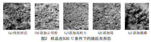 由圖2可以看出,純校樹皮在920℃條件下灼燒后已明顯結(jié)焦,添加了云母粉、高嶺土、煤的試驗(yàn)樣品未發(fā)生明顯結(jié)焦,添加硫磺的樣品灰結(jié)焦情況與純校樹皮樣品對(duì)照基本無改善,其效果差的原因可能是硫磺的沸點(diǎn)為445℃,在焦炭燃燒前已沸騰變?yōu)闅鈶B(tài)排出,幾乎未與焦炭燃燒后組分發(fā)生反應(yīng)。