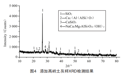 為進(jìn)一步研究燃燒過程中添加劑對(duì)校樹皮結(jié)焦特性的影響,選擇了添加高嶺土樣品灼燒后灰樣和純校樹皮灼燒后灰樣進(jìn)行xRD檢測(cè),結(jié)果如圖3和圖4所示。