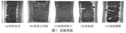 粉碎的校樹皮與添加物充分混合后放入瓷盤方舟,制備完畢的樣品如圖1所示。