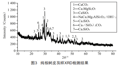 由圖3可以看出,純校樹皮灼燒后灰主要成分為Casio3、CaCo3及少量Ca2Mgsi2o7,NaCa2Mg5A1si7o22(oH)2、Ca5(sio4)2Co3等。Cao、CaCo3開始與sio2發(fā)生反應(yīng),生成Ca的硅酸鹽,但仍有大量Ca元素以CaCo3的形式存在,灰中的大部分顆粒都由于顆粒間固相反應(yīng)的存在出現(xiàn)互相粘連燒結(jié)的狀態(tài)。