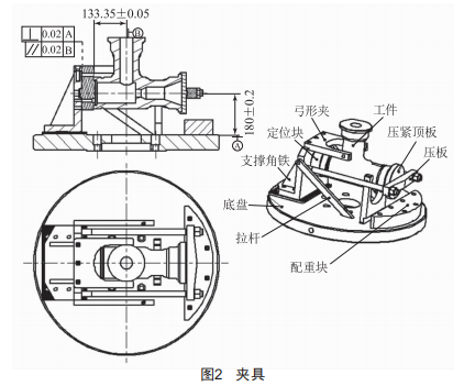 如圖2所示 ,該夾具包括底盤、支撐角鐵、定位塊、拉桿、壓 緊塊、壓板、弓形夾和配重塊 。其中 ,底盤與車床主軸直接連接 ,使得零件縮短懸伸 ,重力更接近主軸 , 以避免切削力對主軸產(chǎn)生共振現(xiàn)象 ,影響表面粗糙度和尺寸精度。支撐角鐵底平面與底盤連接 ,能調(diào)節(jié)中心距與增加穩(wěn)定性 ,定位塊通過孔軸間隙配合 ,螺釘鎖緊在角鐵上 。兩個拉桿一頭連接角鐵 ,一端連接在底盤上 ,夾具旋轉(zhuǎn)中能更好地穩(wěn)定支撐角鐵。兩個弓形夾兩端螺釘頂緊產(chǎn)品脖子 ,加工中能減少震動 ,確保表面粗糙度。產(chǎn)品裝夾在夾具上會產(chǎn)生一邊偏重現(xiàn)象 ,所以在夾具偏輕一端設(shè)置配重塊 ,保證夾具的靜平衡 ,解決旋轉(zhuǎn)后由于偏重產(chǎn)生旋轉(zhuǎn)離心力、增加跳動、難以保證加工精度的問題。