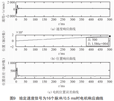 給定速度信號(hào)16個(gè)脈沖/0.5ms時(shí)電機(jī)速度響應(yīng)最大誤差為130個(gè)脈沖,即4.689。