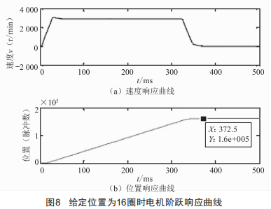 (1)給定位置信號(hào)為16圈(即16×2500×4=160000個(gè)脈沖)時(shí)電機(jī)的階躍響應(yīng)曲線如圖8所示。