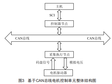 基于CAN總線的伺服電機(jī)控制系統(tǒng)實(shí)現(xiàn)對(duì)一臺(tái)電機(jī)的位置伺服控制,包括兩個(gè)節(jié)點(diǎn):主控制器節(jié)點(diǎn)、信號(hào)采集及執(zhí)行機(jī)構(gòu)節(jié)點(diǎn)。其整體結(jié)構(gòu)框圖如圖3所示。