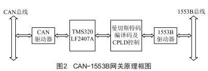 CAN一1553B網(wǎng)關(guān)的實(shí)現(xiàn)框圖如圖2所示。其中,CAN控制器由DsP外圍電路提供,CAN總線接口模塊實(shí)現(xiàn)網(wǎng)關(guān)與CAN總線之間的通信:CPU模塊及曼徹斯特編譯碼模塊實(shí)現(xiàn)了CAN總線協(xié)議與1553B總線協(xié)議之間的轉(zhuǎn)換:1553B接口模塊則實(shí)現(xiàn)網(wǎng)關(guān)與1553B總線之間的通信,從而實(shí)現(xiàn)系統(tǒng)任務(wù)機(jī)對(duì)CAN總線網(wǎng)絡(luò)節(jié)點(diǎn)的監(jiān)控。