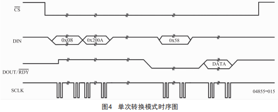 AD779M最簡(jiǎn)單轉(zhuǎn)換模式,只需將相應(yīng)的配置信息寫入模式寄存器,芯片便可自動(dòng)進(jìn)入單次轉(zhuǎn)換模式。轉(zhuǎn)換完成后,將D0UT/RDy引腳拉低,待控制器讀取數(shù)據(jù)寄存器數(shù)據(jù)后,芯片便進(jìn)入關(guān)斷模式,等待下一次指令喚醒。單次轉(zhuǎn)換的時(shí)序如圖4所示。