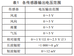 目前,海洋自動(dòng)氣象站上的氣象傳感器有風(fēng)速風(fēng)向、相對(duì)濕度、氣溫、氣壓、雨量、長(zhǎng)波輻射和太陽短波輻射傳感器,其中風(fēng)速風(fēng)向、相對(duì)濕度、氣壓、雨量、長(zhǎng)波輻射電壓值和太陽短波輻射電壓值均為電壓輸出,具體輸出電壓如表1所示,而氣溫、長(zhǎng)波外殼溫度和長(zhǎng)波穹頂溫度為電阻輸出。