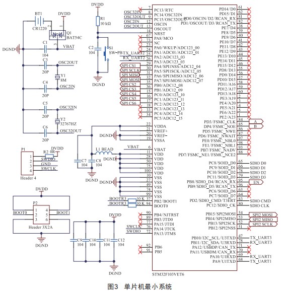 STM32的單片機(jī)外設(shè)豐富、電路簡(jiǎn)單,故選用了其F103系列芯片,單片機(jī)外圍電路如圖3所示。