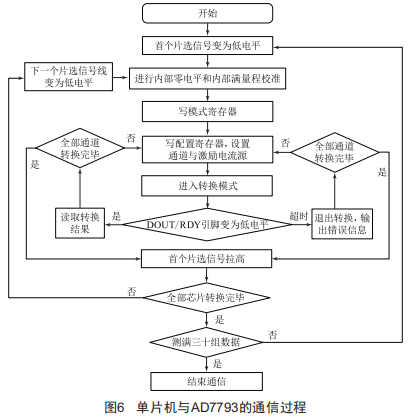AD7793的通信過程與AD7193不同,原因主要在于AD7793無法同時(shí)使能多個(gè)模擬轉(zhuǎn)換通道,開啟一次轉(zhuǎn)換只能測(cè)試一個(gè)通道。片選引腳拉低之后,便可設(shè)置模式寄存器和配置寄存器,設(shè)置激勵(lì)電流源大小,開啟單次轉(zhuǎn)換模式,ADC便進(jìn)入相應(yīng)通道的轉(zhuǎn)換過程中。等待轉(zhuǎn)換完成并讀取轉(zhuǎn)換結(jié)果,完成后再次對(duì)配置寄存器進(jìn)行寫操作,改變使能通道,而保持激勵(lì)電流源等設(shè)置不變,進(jìn)入下一通道的轉(zhuǎn)換,直至此芯片的每一個(gè)通道都執(zhí)行完成轉(zhuǎn)換操作,便進(jìn)入下一AD7793芯片的轉(zhuǎn)換過程。循環(huán)采集三十組電壓數(shù)據(jù),取平均值并用于計(jì)算待測(cè)電阻阻值。單片機(jī)與AD7793的具體通信過程如圖6所示。