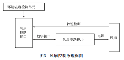 圖3所示為風(fēng)扇控制原理框圖。風(fēng)扇控制接口與風(fēng)扇驅(qū)動模塊采用數(shù)字接口連接,根據(jù)環(huán)境溫度的實際情況,設(shè)定相應(yīng)的風(fēng)扇驅(qū)動電源電壓,從而達到需要的風(fēng)扇轉(zhuǎn)速。同時,風(fēng)扇驅(qū)動模塊的電壓和電流值也可通過數(shù)字接口傳送給風(fēng)扇控制接口。該方法實現(xiàn)了風(fēng)扇的閉環(huán)控制、靈活調(diào)節(jié),延長了風(fēng)扇的使用壽命。